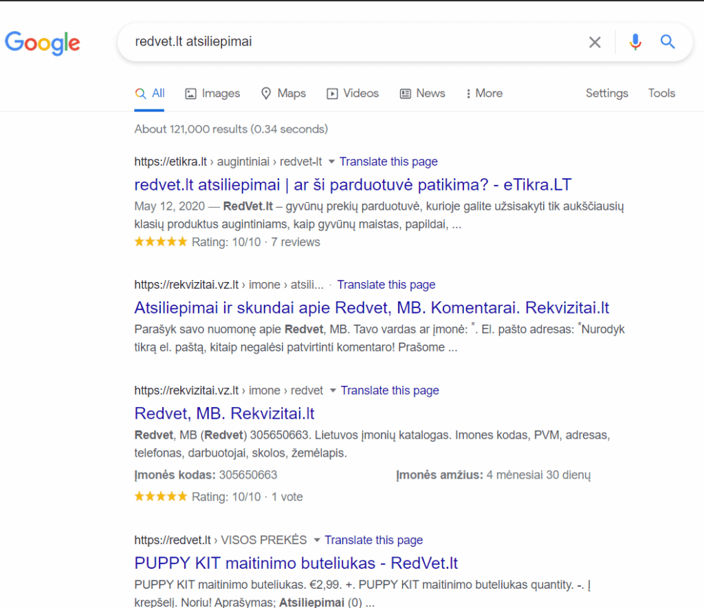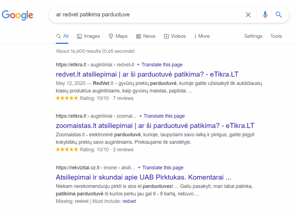 Tikriausiai nereikia nei sakyti, jog teigiami parduotuvės įvertinimai pirmame Google paieškos rezultatų puslapyje stipriai padidina pardavimų konversiją. Pavyzdžiui vėl naudojame RedVet.LT parduotuvę: